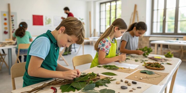 Elementary school students are concentrating on creating artworks using natural materials like leaves. Twigs. And stones during an engaging art class. Fostering creativity and environmental awareness