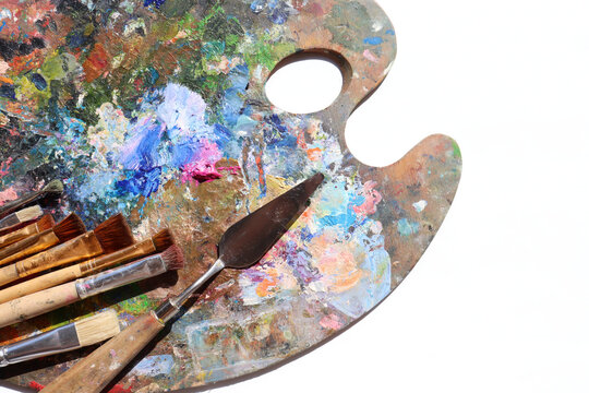 Artist palette with various colors oil paints and brushes on white background. Top view, copy space.