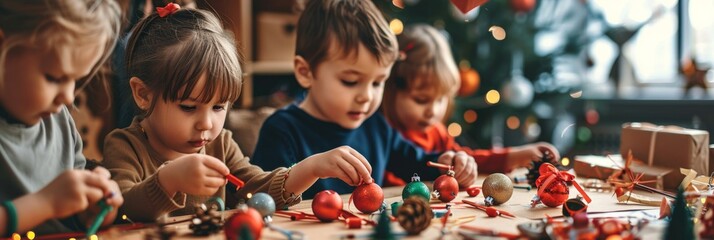 A joyful group of children making DIY Christmas ornaments, surrounded by craft materials in a cheerful atmosphere, banner