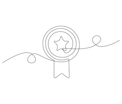 Winning badge in one continuous line drawing. Symbol of a winner. Award winning ribbon in simple linear style. Editable stroke. Doodle line illustration