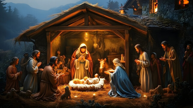 Nativity. Figures gathered in reverence under the holy star. Digital painting.