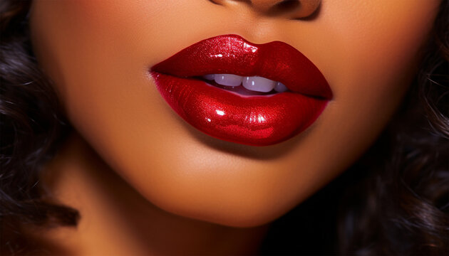 Lipstick Advertisement design African American beauty Sensual woman wearing ruby red lipstick on her lips, holds red gloss, has half of face covered concept of sensuality and cosmetics