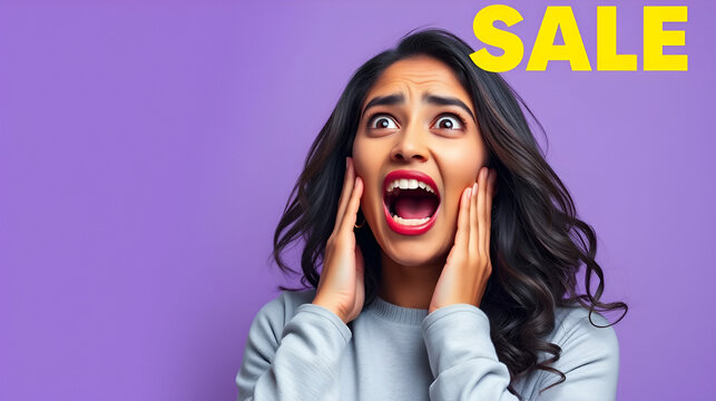 Surprised woman wearing colorful glasses with hands near her face against a pastel background.