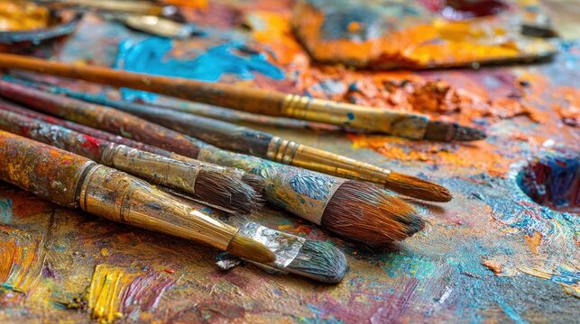 Art supplies displayed with colorful paint splashes. Paintbrushes jars with paint create artistic mood. Top view composition of creative painting tools. Art concept illustration design for workshop