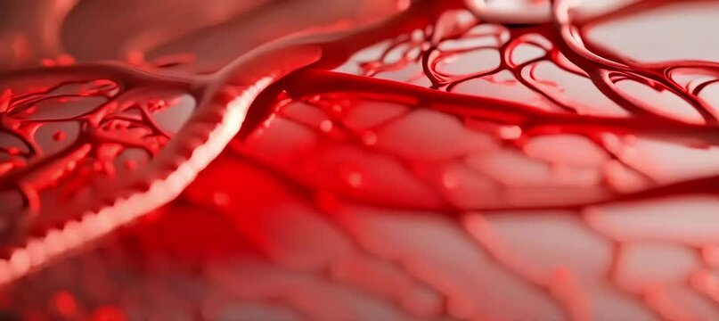 Red blood vessels are growing and branching out on a white background, creating a network of arteries and veins symbolizing the circulatory system