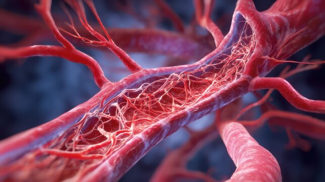 Close examination of human blood vessels reveals a complex network of arteries and veins. This illustration focuses on the intricate details of the cardiovascular system's anatomy and function