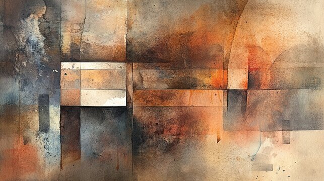 Abstract watercolor painting featuring a harmonious blend of earthy tones and geometric shapes, creating a modern art piece