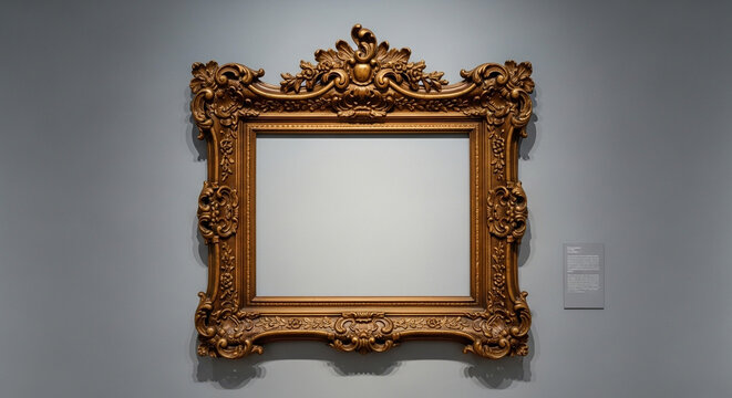 Ornate vintage golden frame displays artwork in a museum setting, waiting for your masterpiece to be showcased with elegant grandeur.