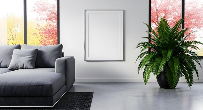 Empty white framed poster on clean white wall for artwork and branding mockup purposes image