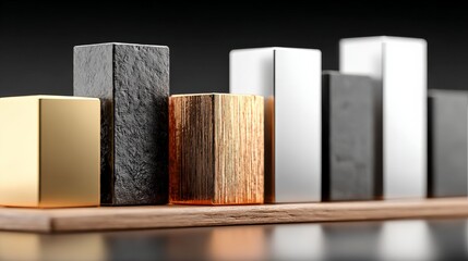 Metallic Cubes Display: An artful composition of metal cubes, each uniquely textured and colored, is artfully arranged on a wooden shelf, illuminated against a dark background.