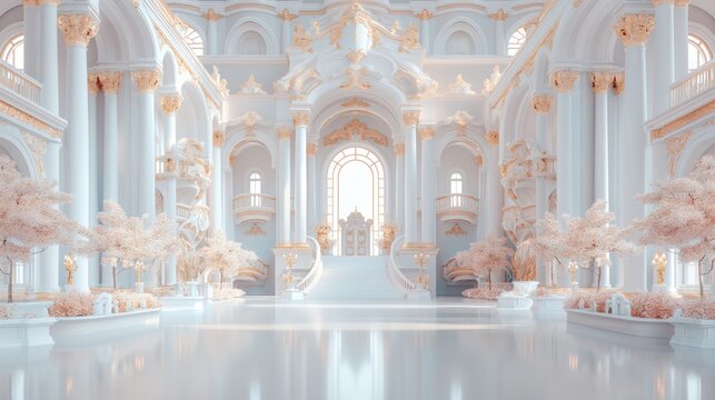 Symmetrical interior of luxury palace with ornate arches and reflective floor.