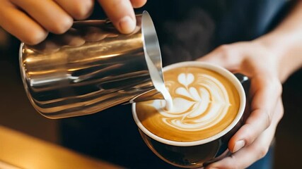 Barista creating latte art with steamed milk, an artful process for a coffee beverage.