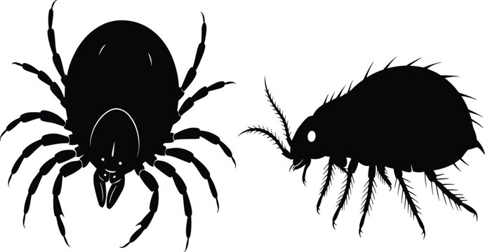 Tick and flea icon set, silhouette arthropods with detailed anatomy, black and white illustration, parasite, insect, vector, entomology, disease grid