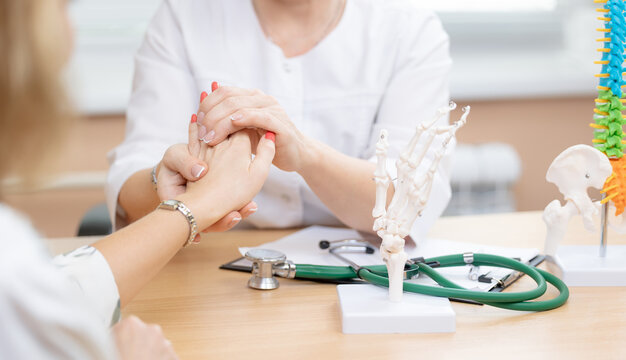 Doctor rheumatologist diagnostics arthrosis of hands of patient. Medical consultation with client in clinic