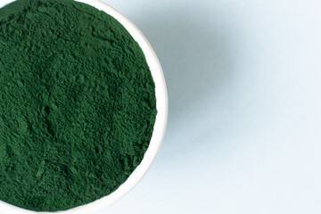 Chlorella powder in a white bowl on a blue background with place for text. Healthy food concept. Horizontal orientation.