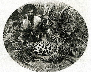 Characters from Arthur Conan Doyle's book The Hound of the Baskervilles: Sherlock Holmes, Dr. Watson and Mr. Stapleton with the hound.