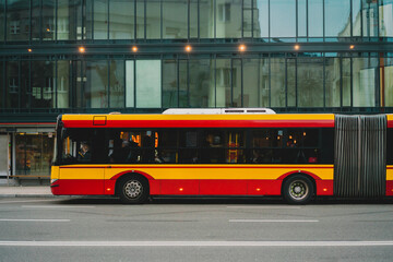 A yellow and red articulated bus parked near business center in the city. Bendy. Tandem. Vestibule bus. Stretch bus. An accordion bus. Articulated vehicle used in public transportation