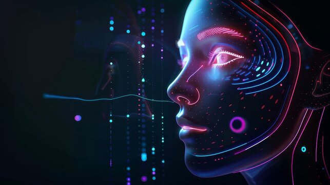 Futuristic neon woman profile portrait with digital data stream in a dark studio artifical intelligence concept