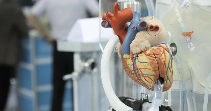 Artificial circulation of blood, man's artificial heart, model of the heart. Donor heart
