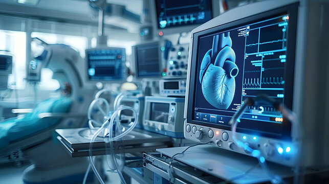 A digital illustration of a human heart with vibrant highlights surrounded by data visuals and graphs representing medical technology and health monitoring