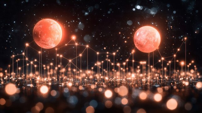 Luminous Blue and Orange Plexus Network Over a Reflective Digital Horizon.