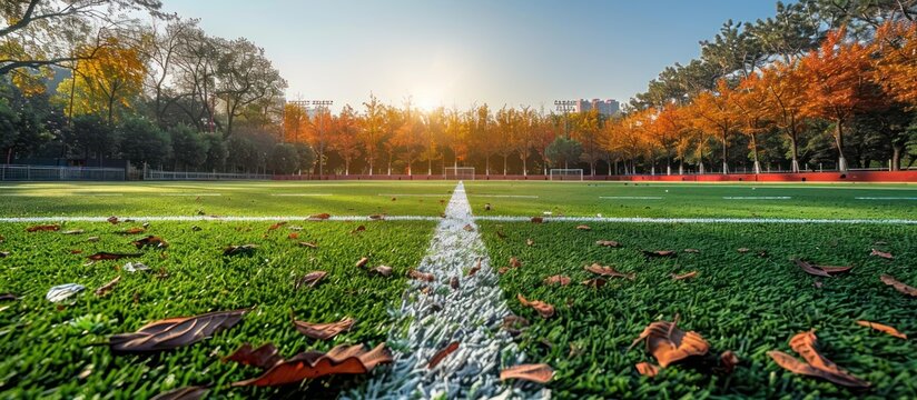 Autumn Leaves Scattered on a Football Field