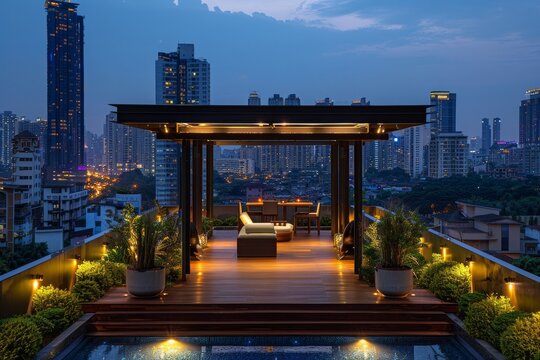 Rooftop lounge with city skyline view, wooden deck, potted plants, and an infinity pool. AI generative. .