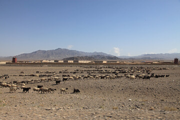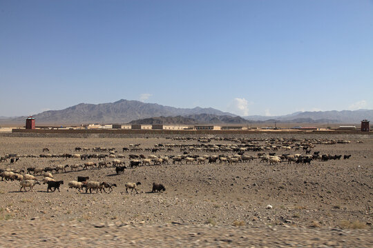 View of a herd of sheep grazing on the arid land near a long building with red towers, under a clear blue sky, Quetta, Balochistan, Pakistan.