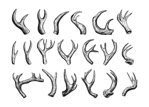 Deer animal horns engraving vector set. Ram antlers sheep antelope moose head bones artiodactyla animals, monochrome hand drawn isolated black vectors on white background