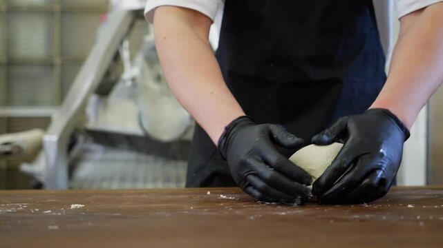 Baking process in a bakery close-up of a baker mixing, kneading, and forming bread dough, professional craftsmanship in traditional artisan baking. High quality 4k footage