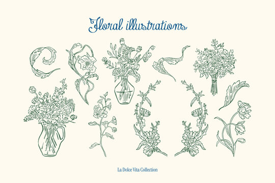 Floral elements set, botanical drawings