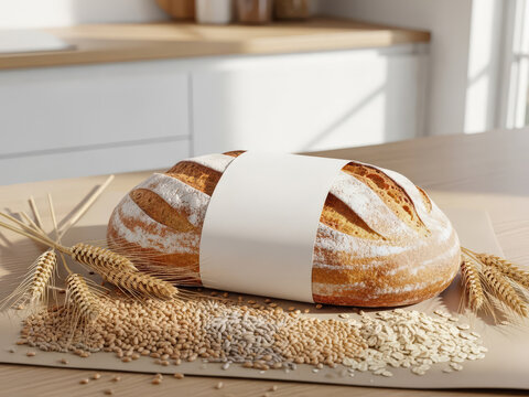 Artisan sourdough bread wrapped in blank label, surrounded by wheat stalks, grains, and oats.