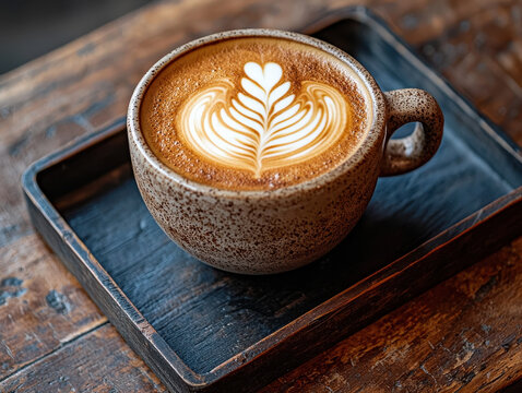Artisan coffee cup with intricate latte art on dark wooden tray in softly lit setting