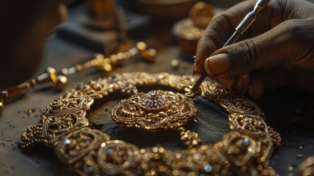 A craftsmans hand carefully works on a detailed gold necklace