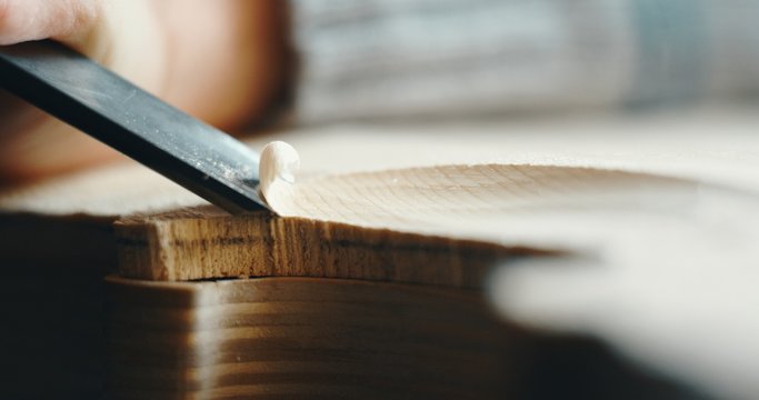 Macro close up of professional master artisan luthier painstaking detailed work on wood violin in a workshop.