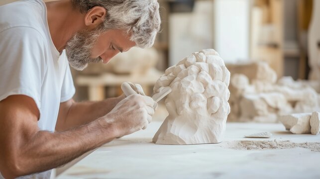 Artisan carves a detailed marble sculpture in a workshop filled with stone creations during daylight hours