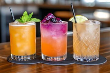A colorful array of refreshing herb-based drinks served in vibrant glasses