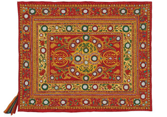 Intricate Rajasthani mirror work fabric, showcasing traditional embroidery with shimmering glass accents, depicted as a realistic 2D vector illustration on a clean white background.