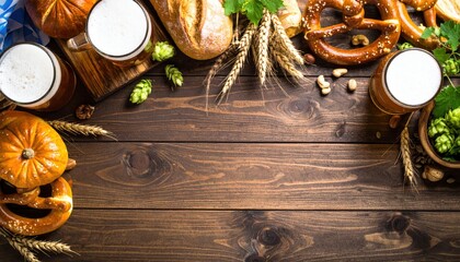 Traditional beer and pretzel pairing oktoberfest celebration food photography rustic setting top-down view cultural experience