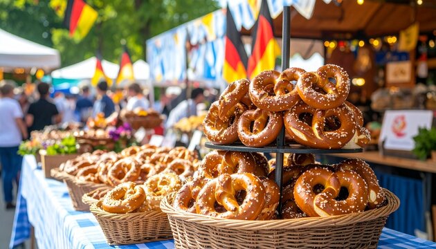 Freshly baked traditional German pretzels with salt crystals displayed in wicker baskets at a vibrant outdoor food festival stall