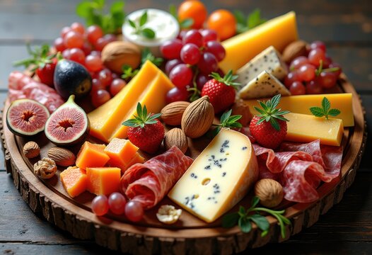 vibrant charcuterie board colorful cheese meats fruits nuts artisan platter textures gourmet delicious arrangement, appetizer, food, spread, classical