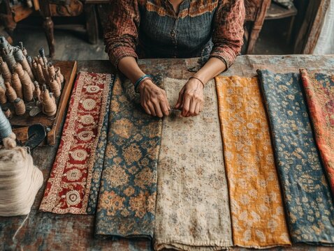 Artisan carefully dyes vibrant silk fabric with natural colors in a serene village setting