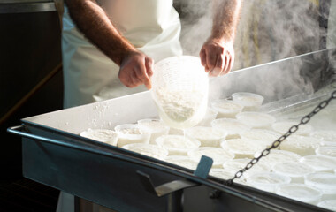 Process of making fresh white soft ricotta whey cheese on small cheese farm in Parma, Italy