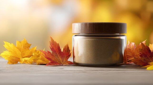 Empty jar label template surrounded by colorful fall leaves. Organic product feel
