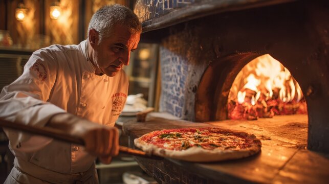 A skilled chef carefully pulls a freshly made pizza from a wood fired oven capturing the essence of Italian cuisine.