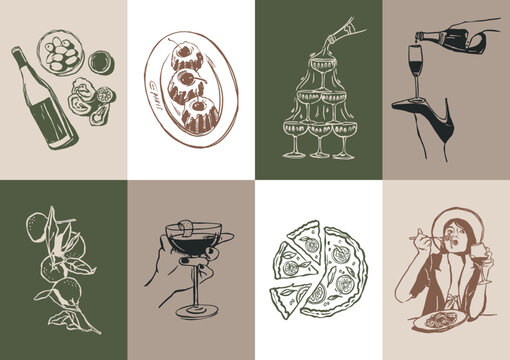 Minimalist hand drawn food and drink vector illustration collection. Matisse style art. Art for print poster, postcards, branding, logo design, background.