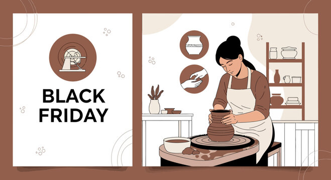 Black Friday pottery promotion with artisan woman crafting ceramics on wheel sale