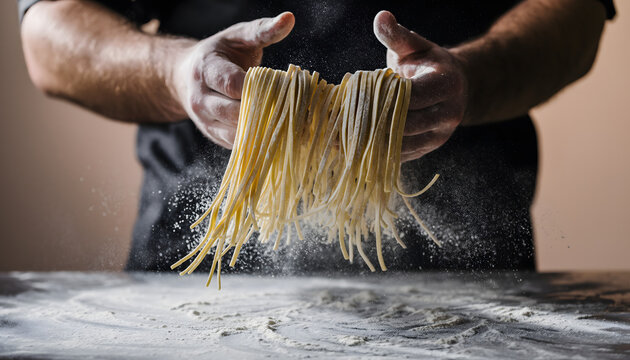 Fresh Pasta Dough strands held by chef with dramatic flour flying, perfect for cooking blogs, Italian restaurant menus, artisan food advertising, and recipe tutorials