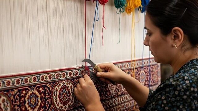 Close-up of hands meticulously weaving a colorful, intricate rug with traditional craftsmanship in a workshop setting.