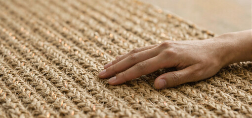 A hand resting on a textured woven jute rug with golden accents.